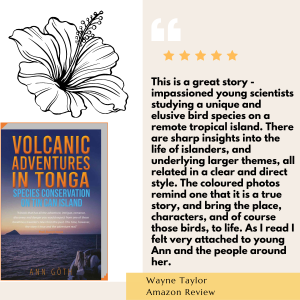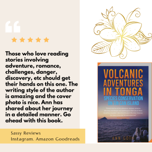 “Like any remarkable travel story, her book is an intriguing mix of difficulties and delights… this book was an exciting opportunity for me to learn about the Tongan people. It includes Ann’s vivid account of various things that are common to many tribal societies, such as matriarchy and having few material possessions. The reader gets to experience the rich culture of the Tongan people and the beauty of the natural world on the remote island as if in person. I loved that it reveals a Westerner’s view of a different culture and the author’s honest opinion of the things she found challenging, including language differences and being told that she is not “big fat” enough. Volcanic Adventures in Tonga offers a fun adventure and a profound, memorable travel experience. It’s also a timely reminder to preserve endangered species and be conscious of climate change. Every travel enthusiast and conservationist would love this book. I didn’t want to miss a thing!.”
