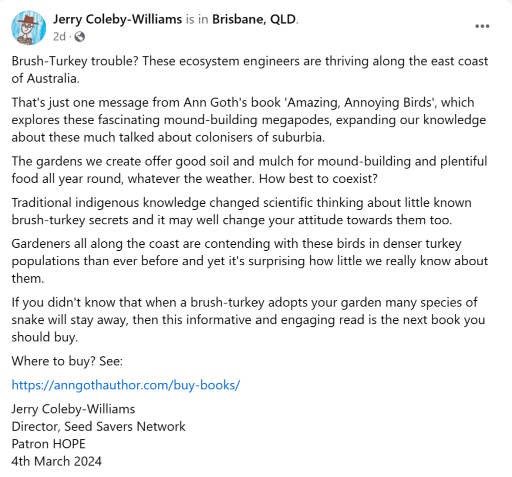the people for whom Brush-turkeys are a part of their lives.” the generous and enthusiastic credit that Ann gives to all the other people who have studied Brush-turkeys, including indigenous owners.” “I thoroughly recommend this book”. — Prof Stephen Garnett’s (Charles Darwin University) review in the journal “Australian Field Ornithology”, https://afo.birdlife.org.au/…/afo/article/view/2320/2347
