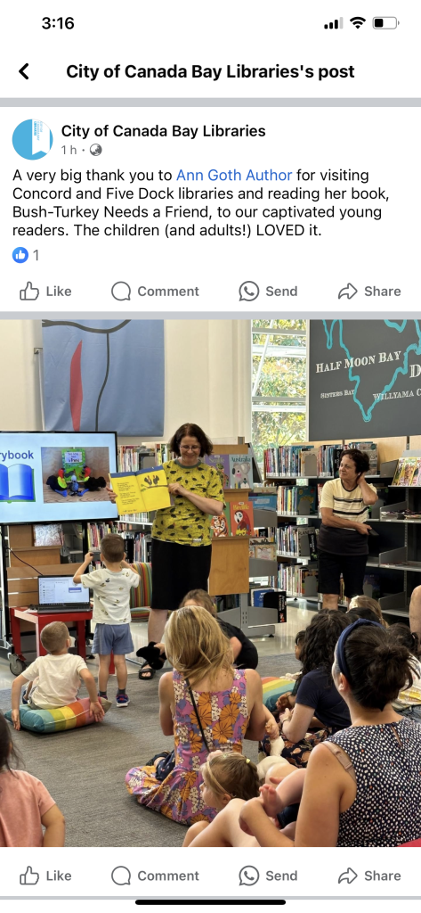 “Bush-turkey Needs a Friend” was launched at Concord Library, Sydney, on March 5th, 2024. It was wonderful to see so many children immersed in my reading of the book, and to watch them having fun with brush-turkey craft afterwards.